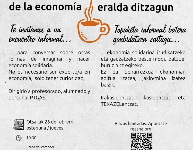 En el marco de la VII Semana Universitaria de la Economía Social, organizada por la Cátedra Economía Social y Cooperativismo de la UPNA, REAS Navarra impulsa un espacio de encuentro y reflexión titulado “Café por una idea: Cambiemos las reglas de la economía”.