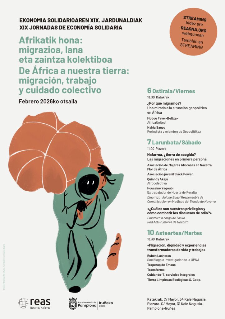 REAS Nafarroak Ekonomia Solidarioaren XIX. Jardunaldiak antolatu ditu Afrikatik datorren migrazioan arreta jarriz eta migrazio-fluxu horien protagonista direnei ahotsa emanez. Giza mugimendu horien arrazoietan sakondu nahi dugu, eta migrazioak gaur egun Nafarroako gizarte osoari, baita Ekonomia Solidarioari ere, egiten dion ekarpena aztertu nahi dugu.