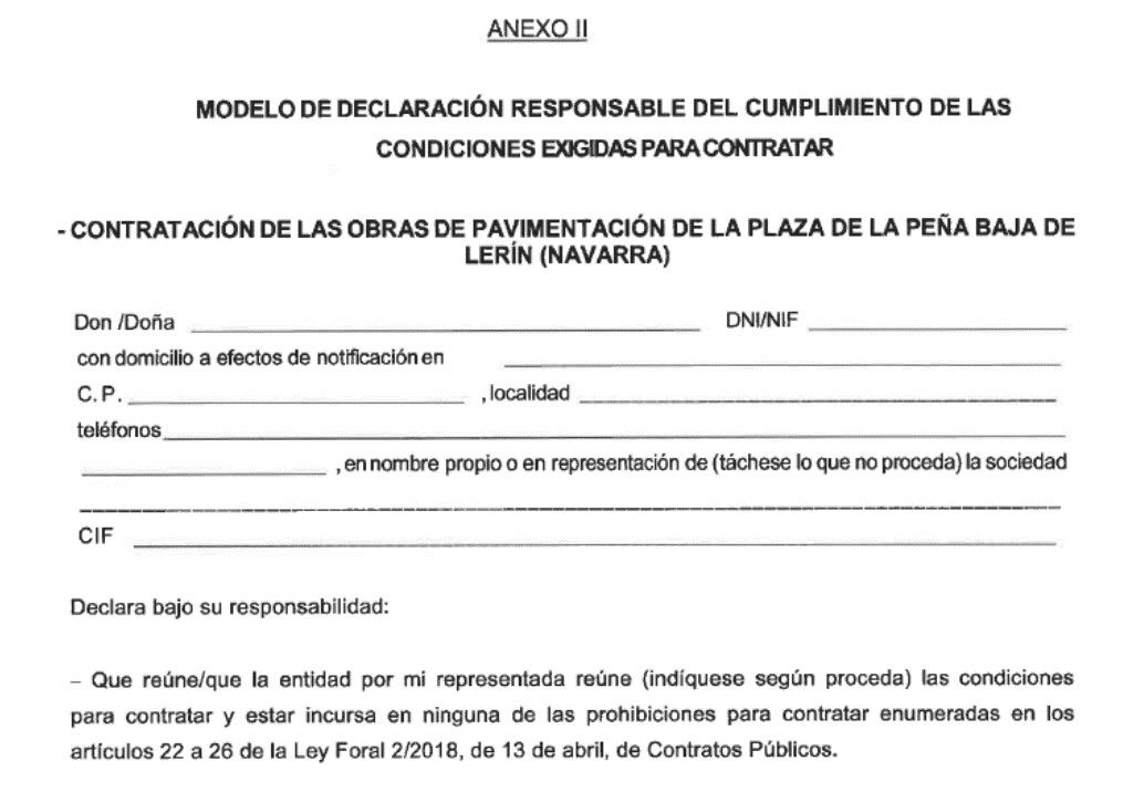 En el pliego de arriba del Ayuntamiento de Lerín vemos que la declaración responsable exige no hallarse la empresa incursa en ninguna de las prohibiciones para contratar.